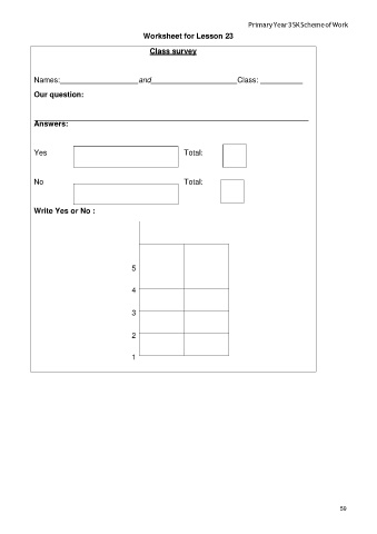 Primary Year 3 SK Scheme of Work Worksheet for Lesson 23 Class survey Names: and Class: Our question: Answers: Yes Total: No Total: Write Yes or No : 5 4 3 2 1 59