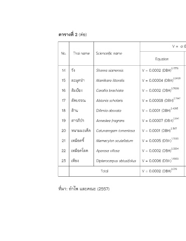 14 รัง Shorea siamensis V = 0.0002 (DBH) 2.1578 0.9588 1.0808 V = 0.0001 (D H) 0.9783 1.1725