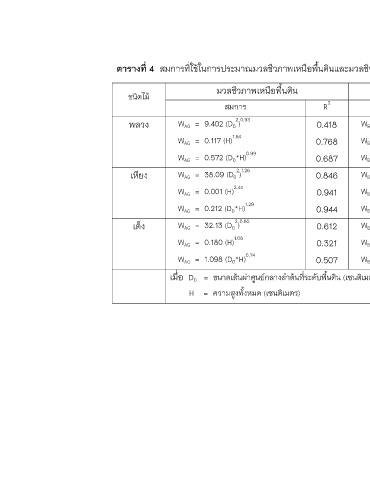 ตารางที่ 4 สมการทีใชในการประมาณมวลชีวภาพเหนือพืนดินและมวลชีวภาพใตพืนดินของกลาไมวงศไมยาง