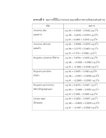 ตารางที่ 5 สมการที่ใชในการประมาณมวลชวภาพรายตนของสวนตางๆ ของตนไมในปาชายเลน