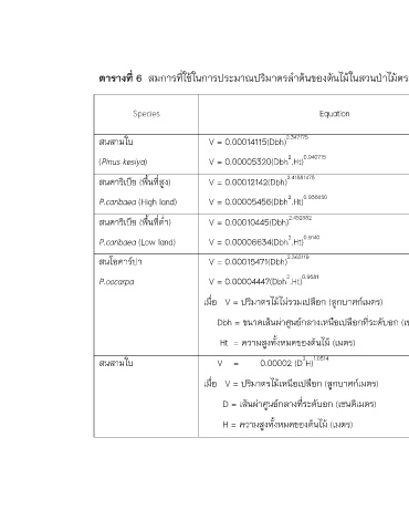 ตารางที่ 6 สมการทีใชในการประมาณปริมาตรลําตนของตนไมในสวนปาไมตระกูลสน