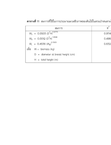 ตารางที่ 11 สมการทีใชในการประมาณมวลชีวภาพของตนไมในสวนปาสนสามใบหลายชนอายุบนพืนที่ตนน้าในจังหวัดเชยงใหม