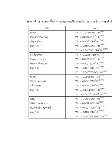 ตารางที่ 12 สมการทีใชในการประมาณปริมาตรลําตนและมวลชีวภาพของตนไมในสวนปาชนิดตางๆ ในประเทศไทย