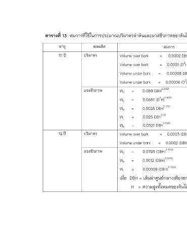 ตารางที่ 13 สมการทีใชในการประมาณปริมาตรลําตนและมวลชีวภาพของตนไมในสวนปาสักในจงหวัดกําแพงเพชร