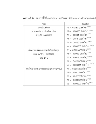 ตารางที่ 14 สมการทีใชในการประมาณปริมาตรลําตนและมวลชีวภาพของตนไมในสวนปาไมสัก