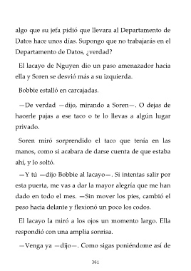 —Y tú —dijo Bobbie al lacayo—. Si intentas salir por