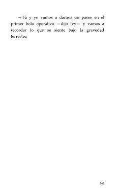 —Tú y yo vamos a darnos un paseo en el primer bolo operativo —dijo Ivy— y vamos a recordar lo que se siente bajo la gravedad terrestre. 346
