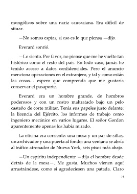 —No somos espías, si eso es lo que piensa —dijo.