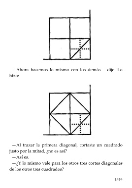 —Ahora hacemos lo mismo con los demás —dije. Lo hizo: —Al trazar la primera diagonal, cortaste un cuadrado justo por la mitad, ¿no es así? —Así es. —¿Y lo mismo vale para los otros tres cortes diagonales de los otros tres cuadrados? 1454