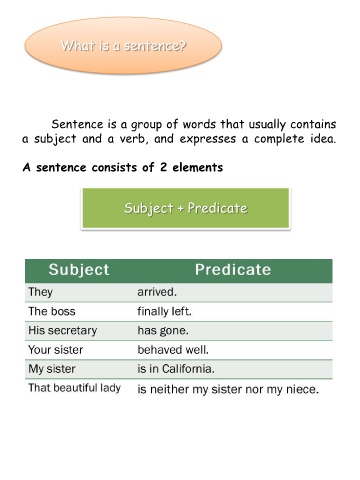 What is a sentence? Sentence is a group of words that usually contains a subject and a verb, and expresses a complete idea. A sentence consists of 2 elements Subject + Predicate