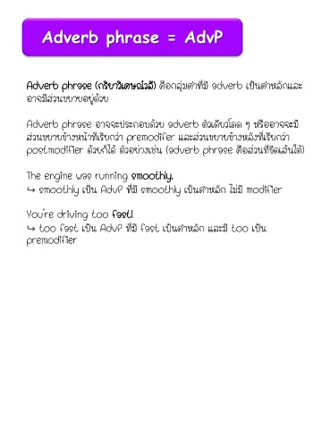 Adverb phrase (กริยาวิเศษณ์วลี) คือกลุ่มค าที่มี adverb เป็นค าหลักและ