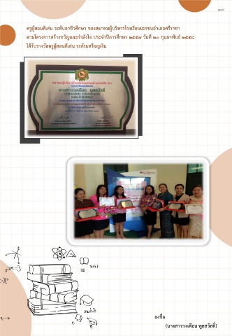 ๓๙ ครูผู้สอนดีเด่น ระดับอาชีวศึกษา ของสมาคมผู้บริหารโรงเรียนเอกชนอ าเภอศรีราชา ตามโครงการสร้างขวัญและก าลังใจ ประจ าปีการศึกษา ๒๕๕๗ วันที่ ๒๐ กุมภาพันธ์ ๒๕๕๘ ได้รับรางวัลครูผู้สอนดีเด่น ระดับเหรียญเงิน ลงชื่อ (นางสาววงเดือน พูลสวัสดิ์)