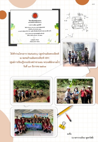 ๔๗ ได้เข้าร่วมโครงการ Marketing ปลูกป่าเฉลิมพระเกียรติ ณ หอชมวิวเฉลิมพระเกียรติ IRPC (ศูนย์การเรียนรู้ระบบนิเวศป่าชายเลน พระเจดีย์กลางน้ า) วันที่ ๑๙ ธันวาคม ๒๕๖๓ ลงชื่อลงชื่อ (นางสาววงเดือน พูลสวัสดิ์)(นางสาววงเดือน พูลสวัสดิ์)