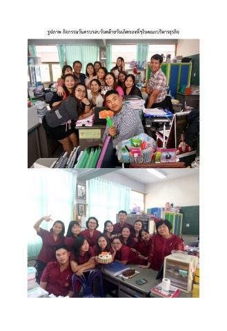 รูปภาพ กิจกรรมวันครบรอบวันคล้ายวันเกิดของพี่ๆในคณะบริหารธุรกิจ ผลงานที่เกิดจากการปฏิบัติหน้าที่ ประจ าปีการศึกษา ๒๕๖1 นายณัฐพงษ์ แซ่อึ้ง ต าแหน่ง ครูอัตราจ้างสาขาวิชาการตลาด วิทยาลัยเทคนิคระยอง สังกัด ส านักงานคณะกรรมการการอาชีวศึกษ