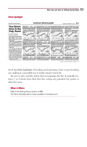 tures 1 or 2 stocks from that day’s list, noting any potential buy points or