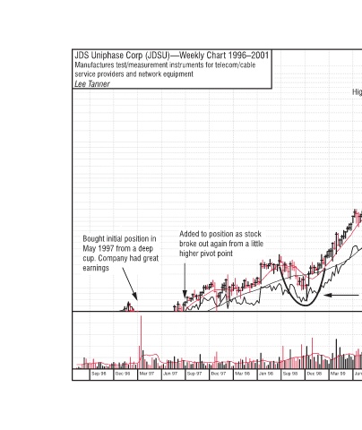 Manufactures test/measurement instruments for telecom/cable JDS Uniphase Corp (JDSU)—Weekly Chart 1996–2001 service providers and network equipment Lee Tanner Bought initial position in May 1997 from a deep higher pivot point cup. Company had great earnings Sep 97 Jun 97 Mar 97 Dec 96 Se