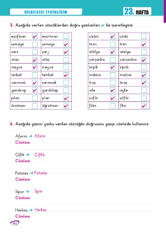 3. Aşağıda verilen sözcüklerden doğru yazılanları ✔ ile işaretleyiniz.