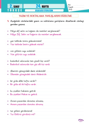 1. Aşağıdaki cümlelerdeki yazım ve noktalama yanlışlarını düzelterek cümleyi