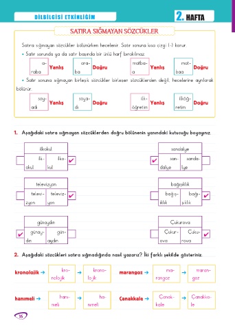 1. Aşağıdaki satıra sığmayan sözcüklerden doğru bölünenin yanındaki kutucuğu boyayınız.