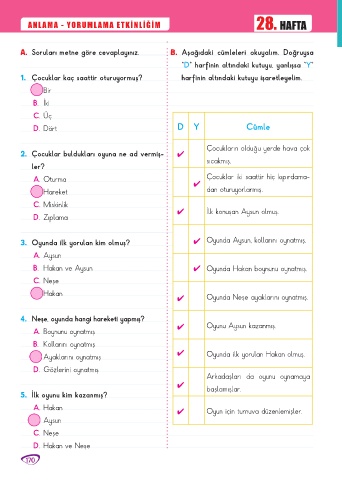 A. Soruları metne göre cevaplayınız. B. Aşağıdaki cümleleri okuyalım. Doğruysa