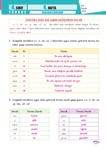 1. Aşağıdaki sözcüklere (-cı, -lı, -lık, -sız ...) eklerinden uygun olanları getirerek türemiş söz-