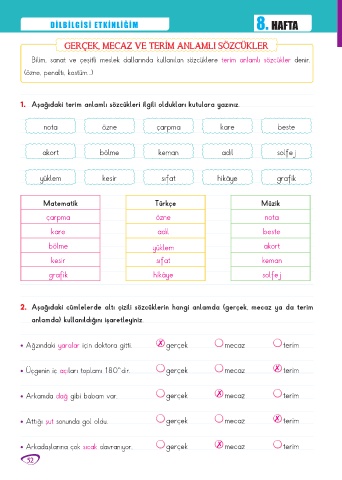 2. Aşağıdaki cümlelerde altı çizili sözcüklerin hangi anlamda (gerçek, mecaz ya da terim