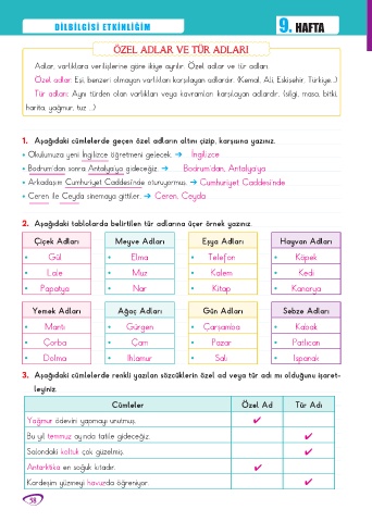 1. Aşağıdaki cümlelerde geçen özel adların altını çizip, karşısına yazınız.