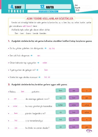 1. Aşağıdaki cümlelerde kişi adı yerine kullanılan sözcükleri (adılları) bulup karşılarına yazınız.