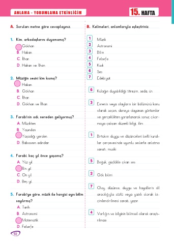 A. Soruları metne göre cevaplayınız. B. Kelimeleri, anlamlarıyla eşleştiriniz.
