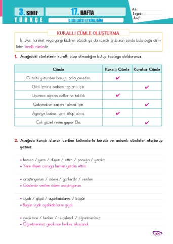 TÜRK ÇE DİLBİLGİSİ ETKİNLİĞİM Sınıfı: ......................................