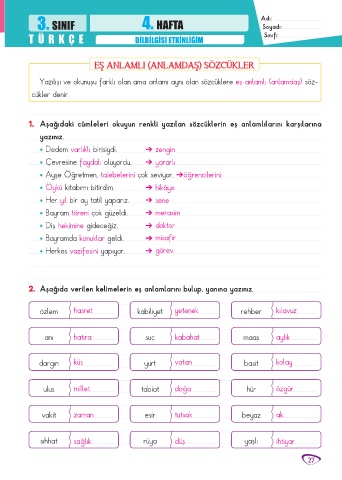 1. Aşağıdaki cümleleri okuyun renkli yazılan sözcüklerin eş anlamlılarını karşılarına