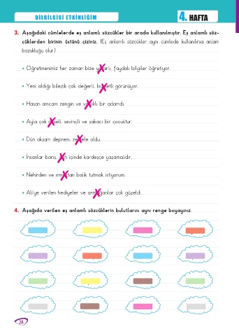 4. Aşağıda verilen eş anlamlı sözcüklerin bulutlarını aynı renge boyayınız.