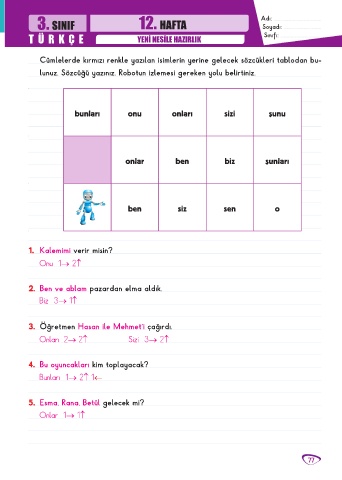 Cümlelerde kırmızı renkle yazılan isimlerin yerine gelecek sözcükleri tablodan bu-