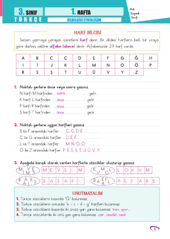 3. SINIF 1. HAFTA Adı: ............................................