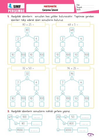 PERŞEMBE Çarpma İşlemi Sınıfı: ........................................