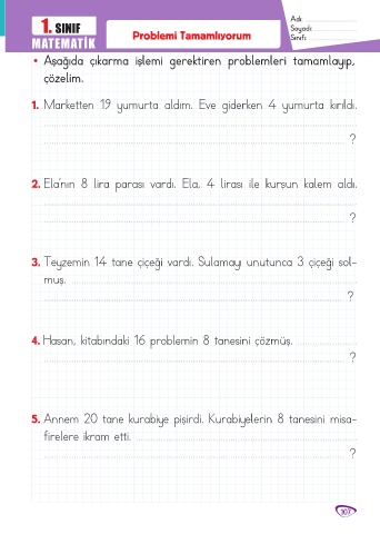 MATEMATİK Problemi Tamamlıyorum Sınıfı: ........................................