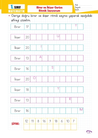 1. SINIF Birer ve İkişer Geriye Soyadı: ...................................