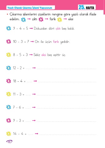 • Çıkarma işlemlerini çiçeklerin rengine göre yazılı olarak ifade