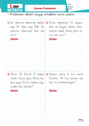 MATEMATİK Çıkarma Problemleri Sınıfı: ........................................