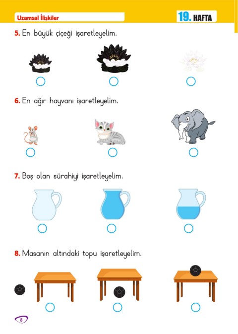 Uzamsal İlişkiler 19. HAFTA 5. En büyük çiçeği işaretleyelim. 6. En ağır hayvanı işaretleyelim. 7. Boş olan sürahiyi işaretleyelim. 8. Masanın altındaki topu işaretleyelim. 8