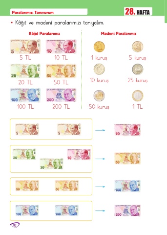 Paralarımızı Tanıyorum 28. HAFTA • Kâğıt ve madeni paralarımızı tanıyalım. Kâğıt Paralarımız Madeni Paralarımız 5 TL 10 TL 1 kuruş 5 kuruş 20 TL 50 TL 10 kuruş 25 kuruş 100 TL 200 TL 50 kuruş 1 TL 82