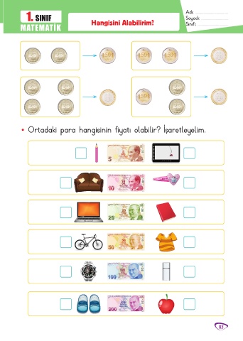 Adı: ........................................... 1. SINIF Soyadı: ................................... MATEMATİK Hangisini Alabilirim? Sınıfı: ........................................ • Ortadaki para hangisinin fiyatı olabilir? İşaretleyelim. 83