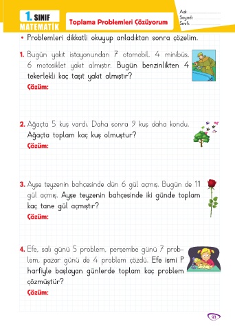 MATEMATİK Toplama Problemleri Çözüyorum Sınıfı: ........................................
