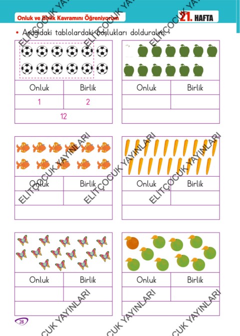 Onluk ve Birlik Kavramını Öğreniyorum 21. HAFTA • Aşağıdaki tablolardaki boşlukları dolduralım. Onluk Birlik Onluk Birlik 1 2 12 Onluk Birlik Onluk Birlik Onluk Birlik Onluk Birlik 28