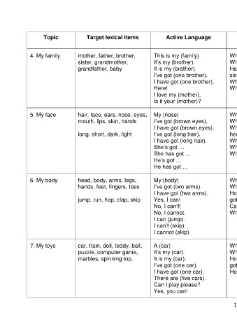 Topic Target lexical items Active Language Passive Language Nursery rhymes / chants / Suggested storybooks