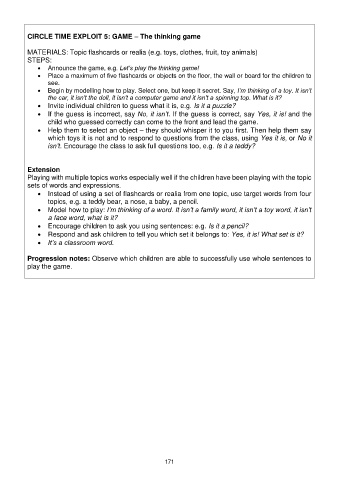Begin by modelling how to play. Select one, but keep it secret. Say, I’m thinking of a toy. It isn’t