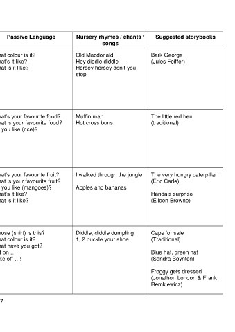 Topic Target lexical items Active Language Passive Language Nursery rhymes / chants / Suggested storybooks