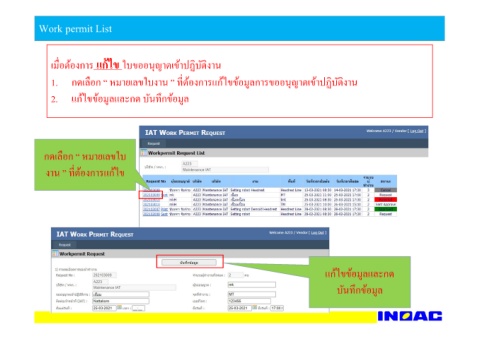 แก้ไขข้อมูลและกด บันทึกข้อมูล ” ทีDต้องการแก้ไขข้อมูลการขออนุญาตเข้าปฏิบัติงาน เมืDอต้องการ แก้ไข ใบขออนุญาตเข้าปฏิบัติงาน กดเลือก “ หมายเลขใบงาน แก้ไขข้อมูลและกด บันทึกข้อมูล Work permit List 1. 2. กดเลือก “ หมายเลขใบ ” ทีDต้องการแก้ไข งาน
