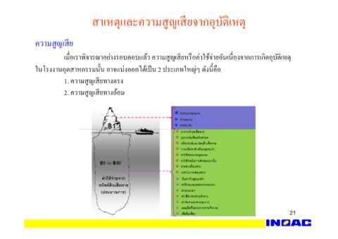 21 เมืDอเราพิจารณาอย่างรอบคอบแล้ว ความสูญเสียหรือค่าใช้จ่ายอันเนืDองจากการเกิดอุบัติเหตุ สาเหตุและความสูญเสียจากอุบัติเหตุ ในโรงงานอุตสาหกรรมนัXน อาจแบ่งออกได้เป็น 2 ประเภทใหญ่ๆ ดังนีXคือ 1. ความสูญเสียทางตรง 2. ความสูญเสียทางอ้อม ความสูญเสีย