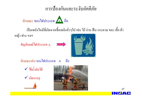 27 การป้องกันและระงับอัคคีภัย ื เปนเพลิงไหม้ทีjเกิดจากเชืHอเพลิงทัjวๆไป เช่น ไม้ ถ่าน ฟน กระดาษ ขยะ เสืHอ ผ้า ลักษณะเด่น ของไฟประเภท A คือ ลักษณะ ของไฟประเภท คือ สัญลักษณ์ไฟประเภท A ใช้นํHาดับได้ เกิดการคุ หญ้า ฟาง ฯลฯ ็